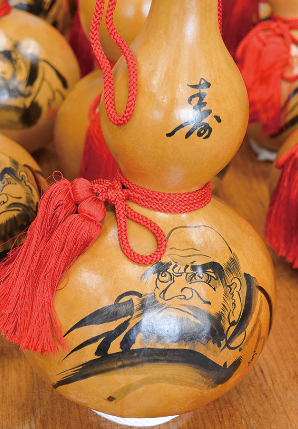 また、一つ一つに「寿」の文字と達磨の絵が書き入れられているが、これらは全て副会長の武田一宏さんが手がけたもの。武田さんは「ひょうたんは表面が平らでないので絵を描くのが難しい」と話す。