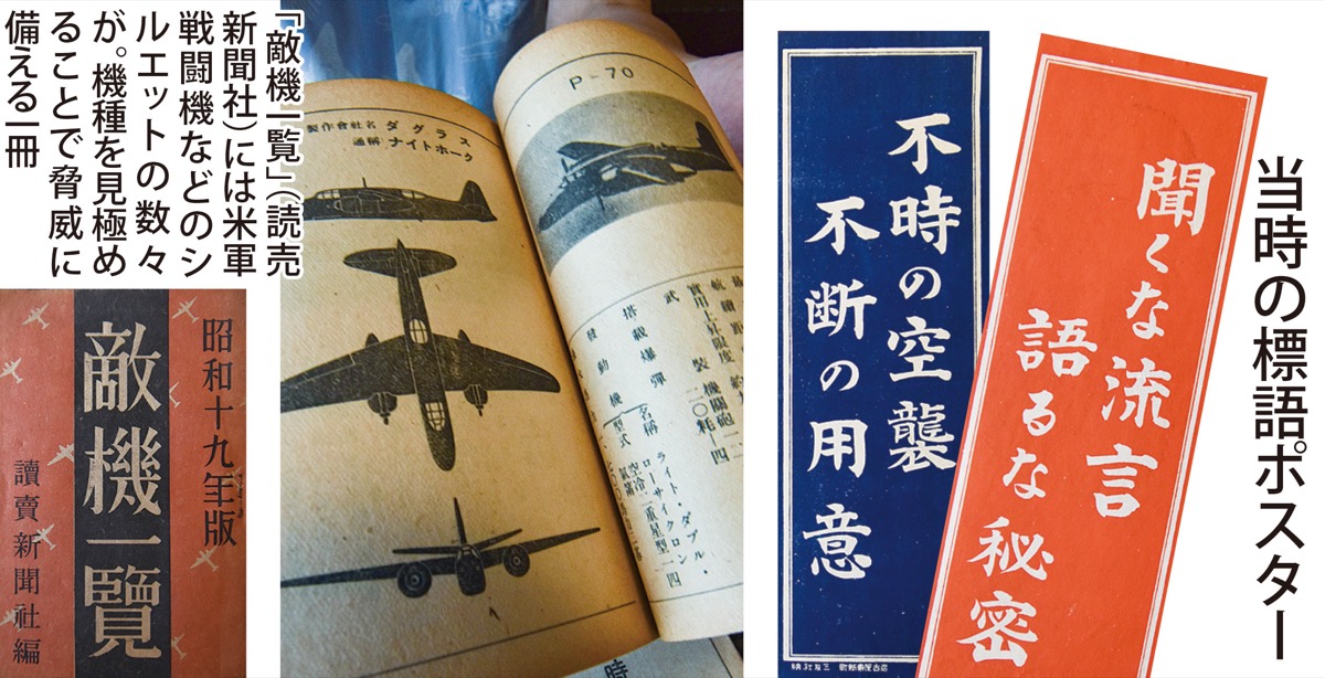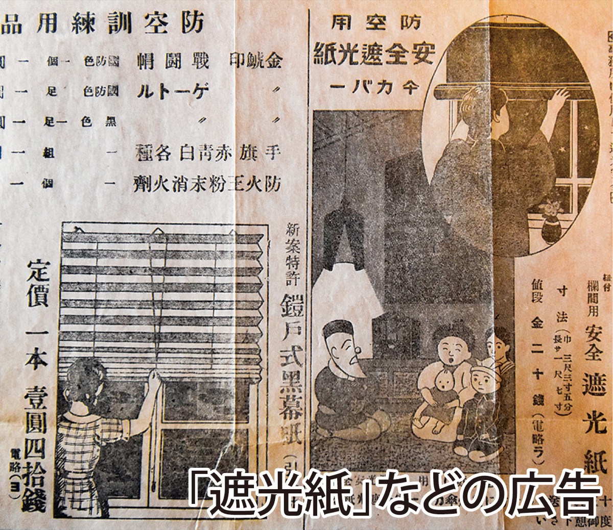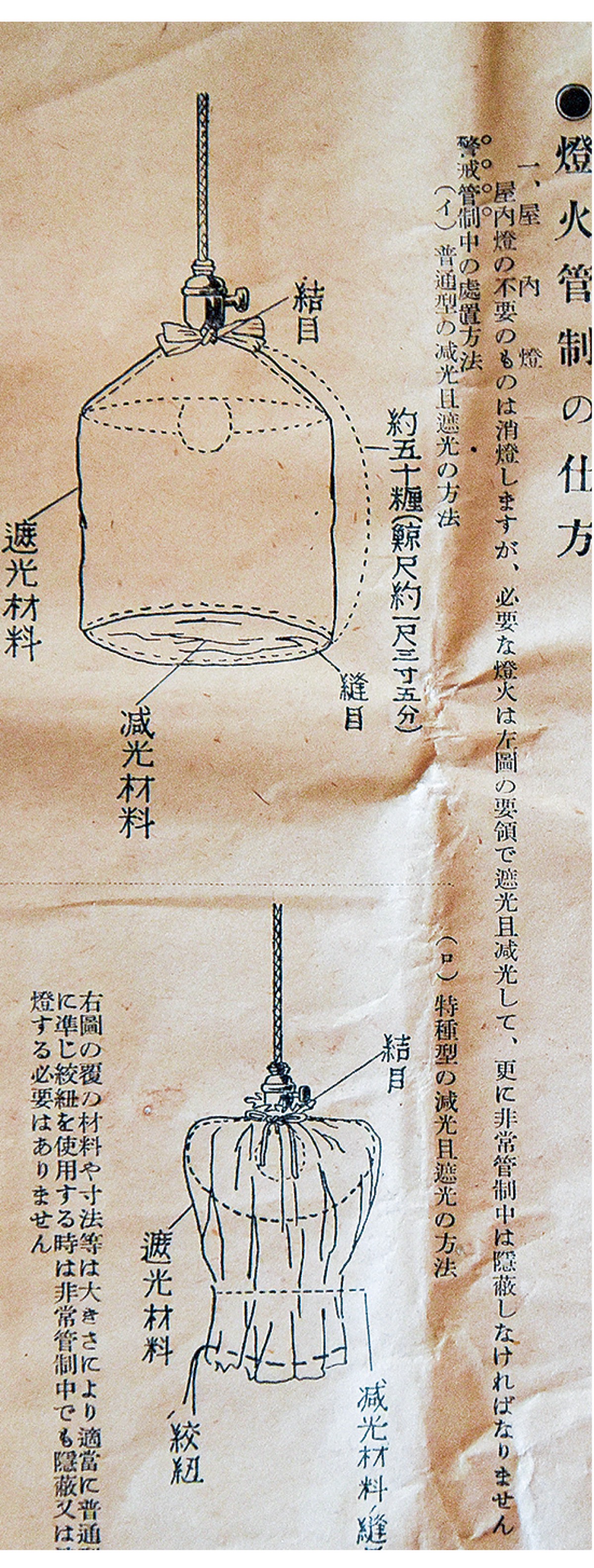 右の図は太平洋戦争が始まる4年ほど前に、茅ヶ崎町民(当時)に配られた資料の一部。各家庭での燈火管制のやり方について材料や寸法などを解説し、店の看板や工場の火気についての指南もある。「空襲時における町民の心得」では、硝子窓に近寄らない、流言や宣伝に惑わされるな等と呼びかけ、毒ガス弾については「腐ったリンゴ」「ドクダミ」といった臭いの一覧も添えられ、警戒していた様子がうかがえる。戦時中、茅ヶ崎は1945年の平塚空襲(市内554世帯1285人が被害)などの戦災に見舞われた。
