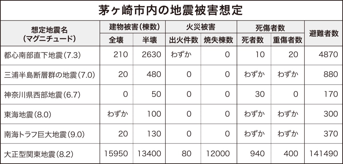 県内では死者が3万1550人と想定。発生確率は30年以内にほぼ0〜5%とされ、茅ヶ崎市も震度7の揺れに見舞われるとされる。