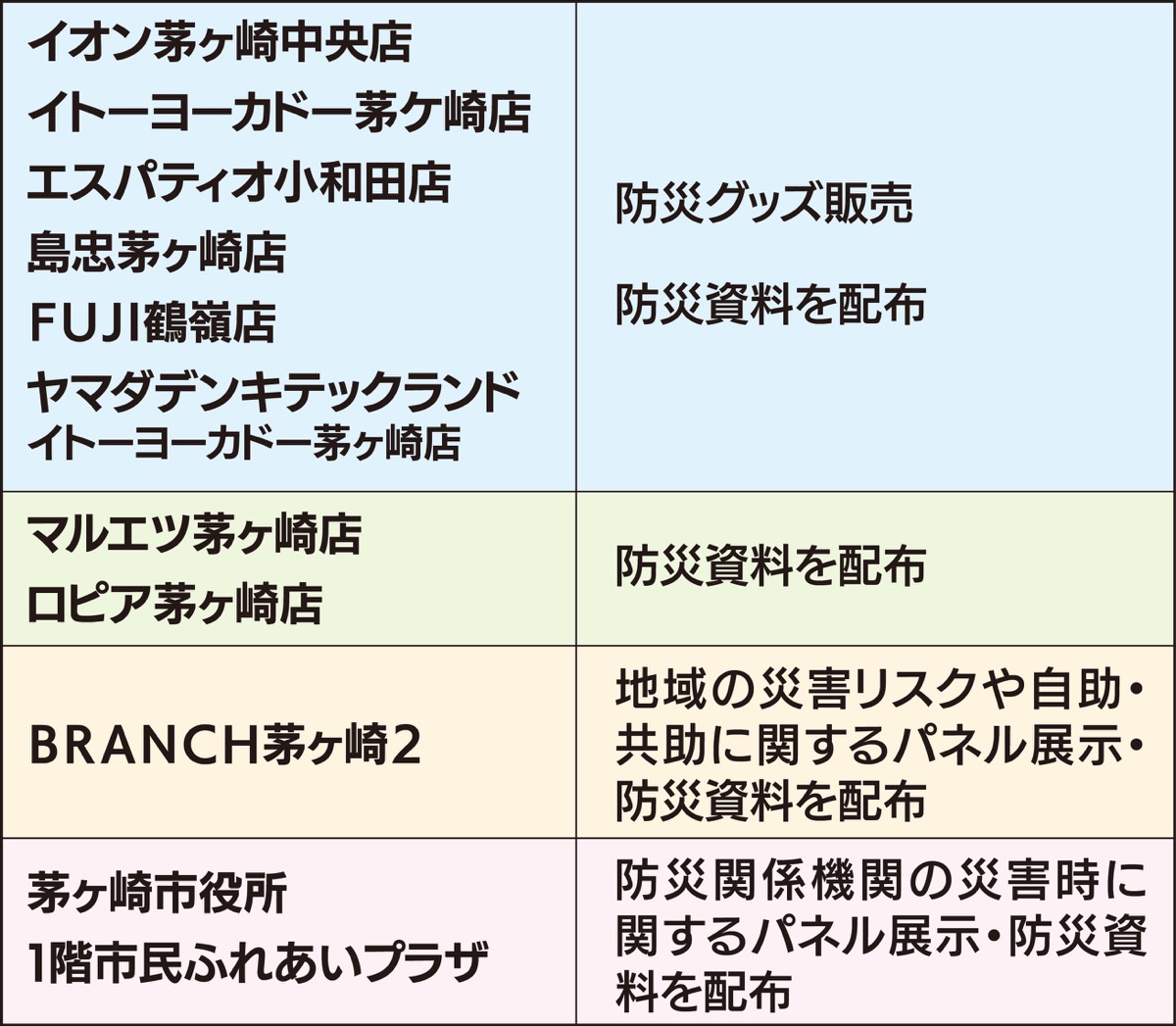 第1回に比べて、協力店舗は1・8倍に増加。展示内容等は店によって異なるが、防災資料の配布のほか非常食や懐中電灯、防災用品セットなどが販売される。