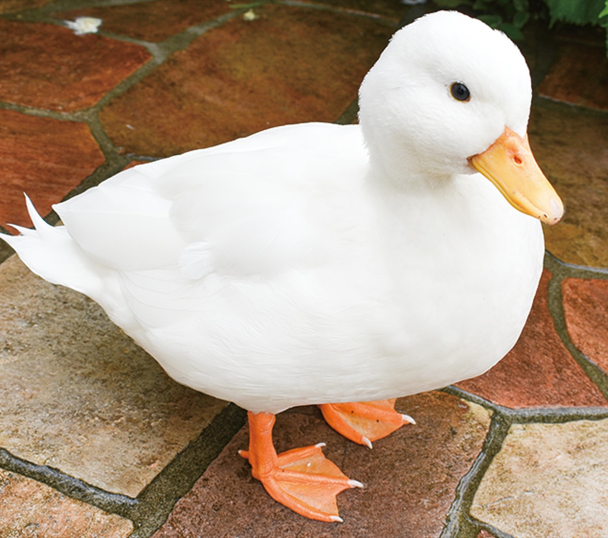 高田在住の笹枝忠さんが飼っているコールダックの梵知(ぼんじり)(3)。「ぼんちゃん」と呼ばれ、地域のアイドル的存在として愛されている。