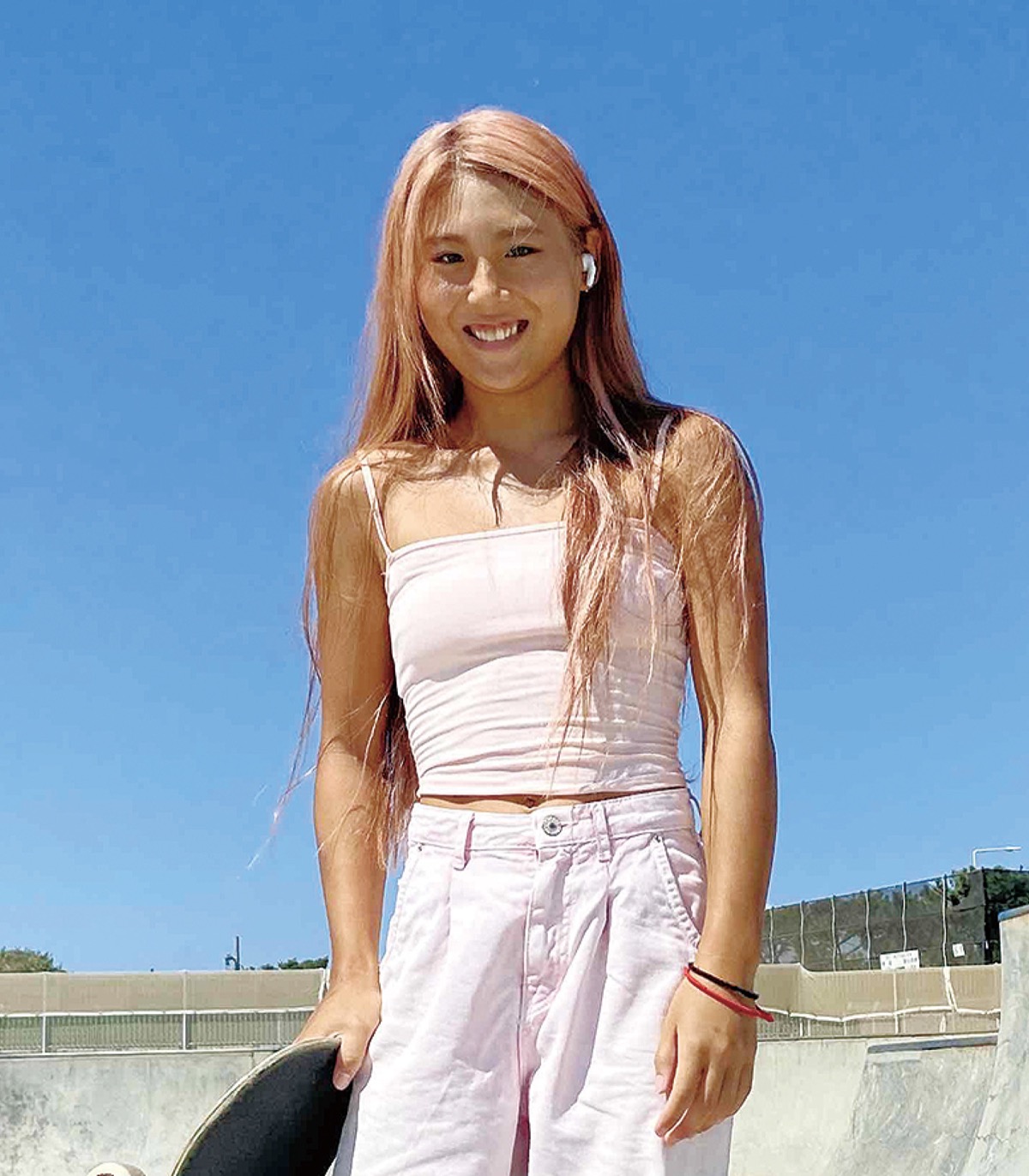スケボーのスキルはもちろん、ファッションやライフスタイル等すべてひっくるめたものが「自分のスタイルにつながる」と言う。お気に入りの洋服に身を包み、ピンク色の髪をなびかせダイナミックなエアを決める。「遊びもおしゃれも楽しみながら、世界を目指します」