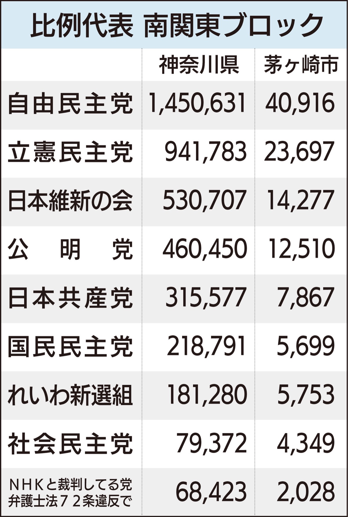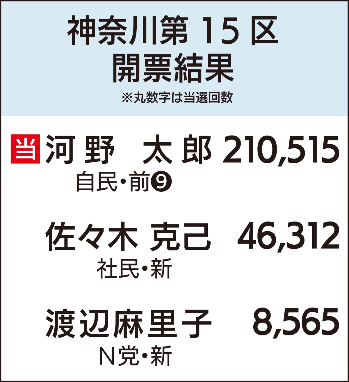 衆議院議員総選挙は10月31日に投開票が行われた。神奈川15区(茅ヶ崎市、平塚市、大磯町、二宮町)は、自民党前職の河野太郎氏(58)が21万515票を獲得し、9回目の当選を果たした。ともに新人で社民党の佐々木克己氏(66)、NHKと裁判してる党弁護士法72条違反での渡辺麻里子氏(45)は河野氏の牙城を崩すことができなかった。茅ヶ崎市内の投票率は前回より6・19ポイント高い58・24%だった。