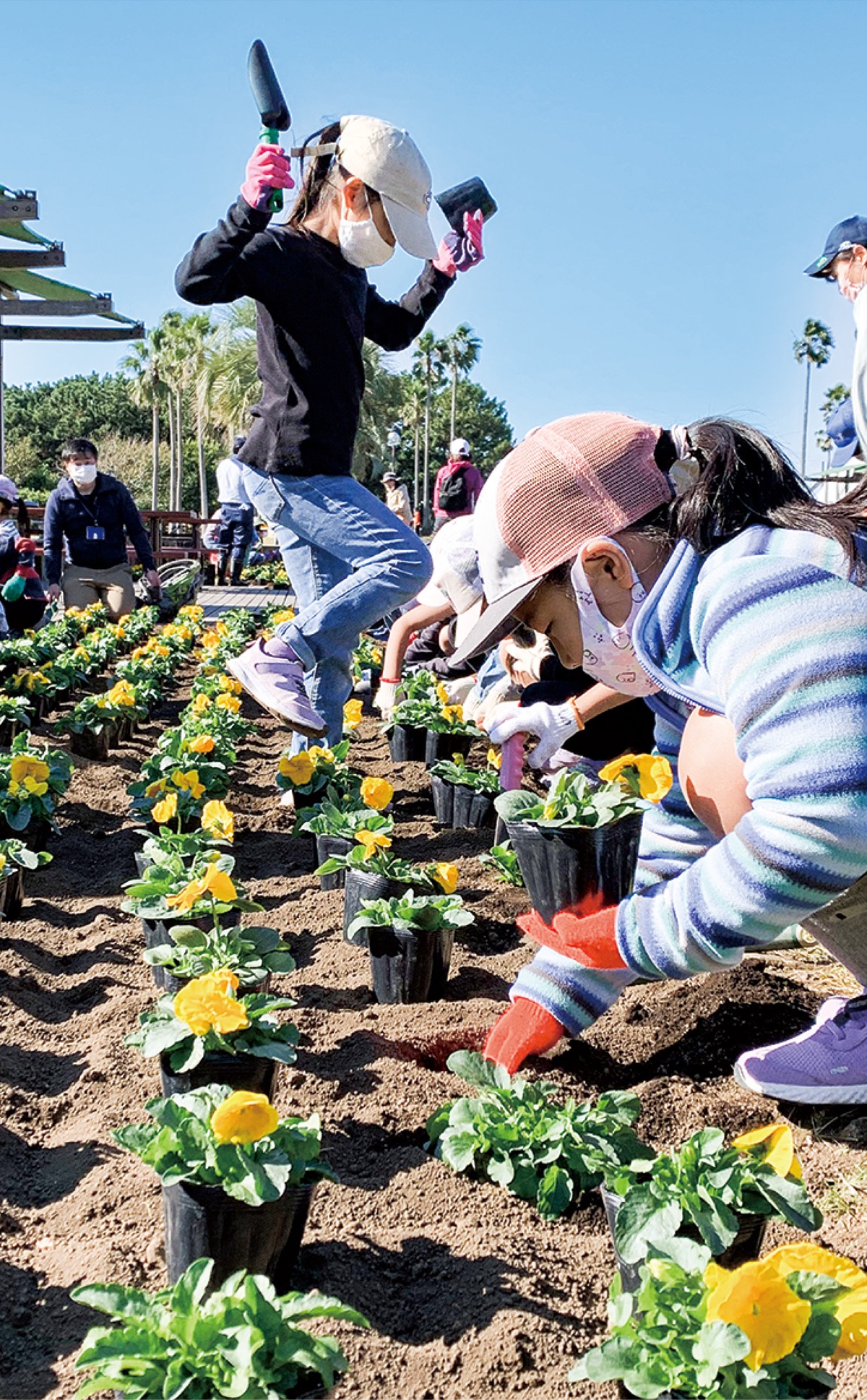 松浪小学校(安倍武雄校長)の2年生児童約150人が11月12日、県立辻堂海浜公園でパンジーの花苗約3200ポットを植栽した。