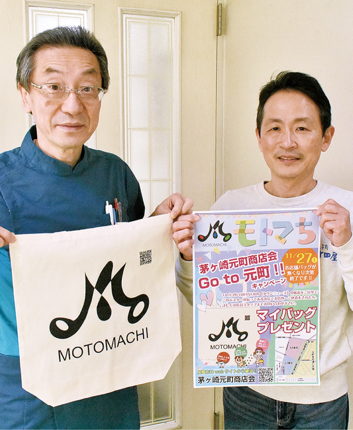 バッグにはSZK GALLERYの鈴木清安さんがデザインしたロゴを印刷。足と音符、えぼし岩のフォルムを使い、元町のMを表現しているという。「生まれ育った場所なので楽しくリズミカルに歩ける街をイメージした」と鈴木さん。下里理事長は「少しでもお客さんが戻ってきて街の活性化につながれば」と話した。(問)村田屋【電話】0467・82・3160