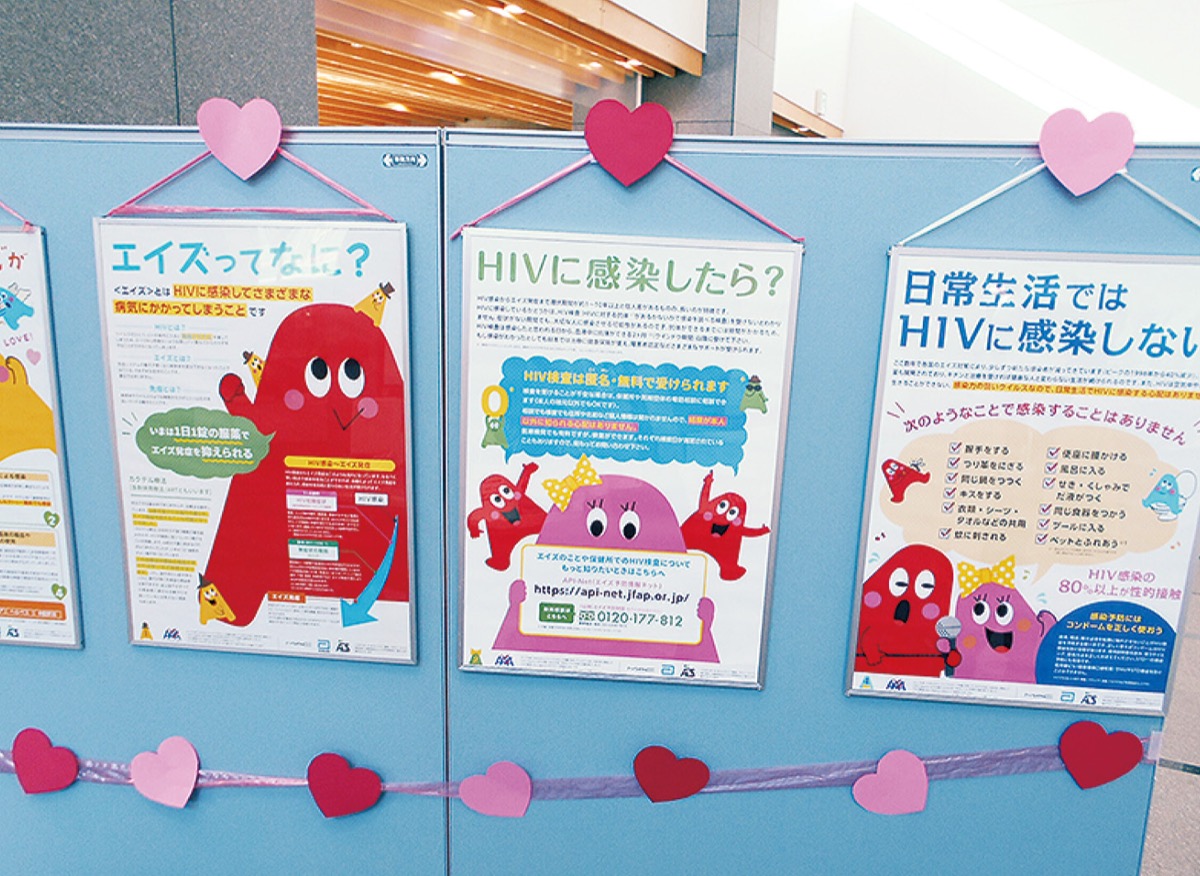 1日の世界エイズデーに合わせて3年前から行っている同展。エイズ予防の呼びかけと検査周知のため、パネル展やクイズ、参加型のレッドリボンツリーの作成、啓発品の配布を行う。