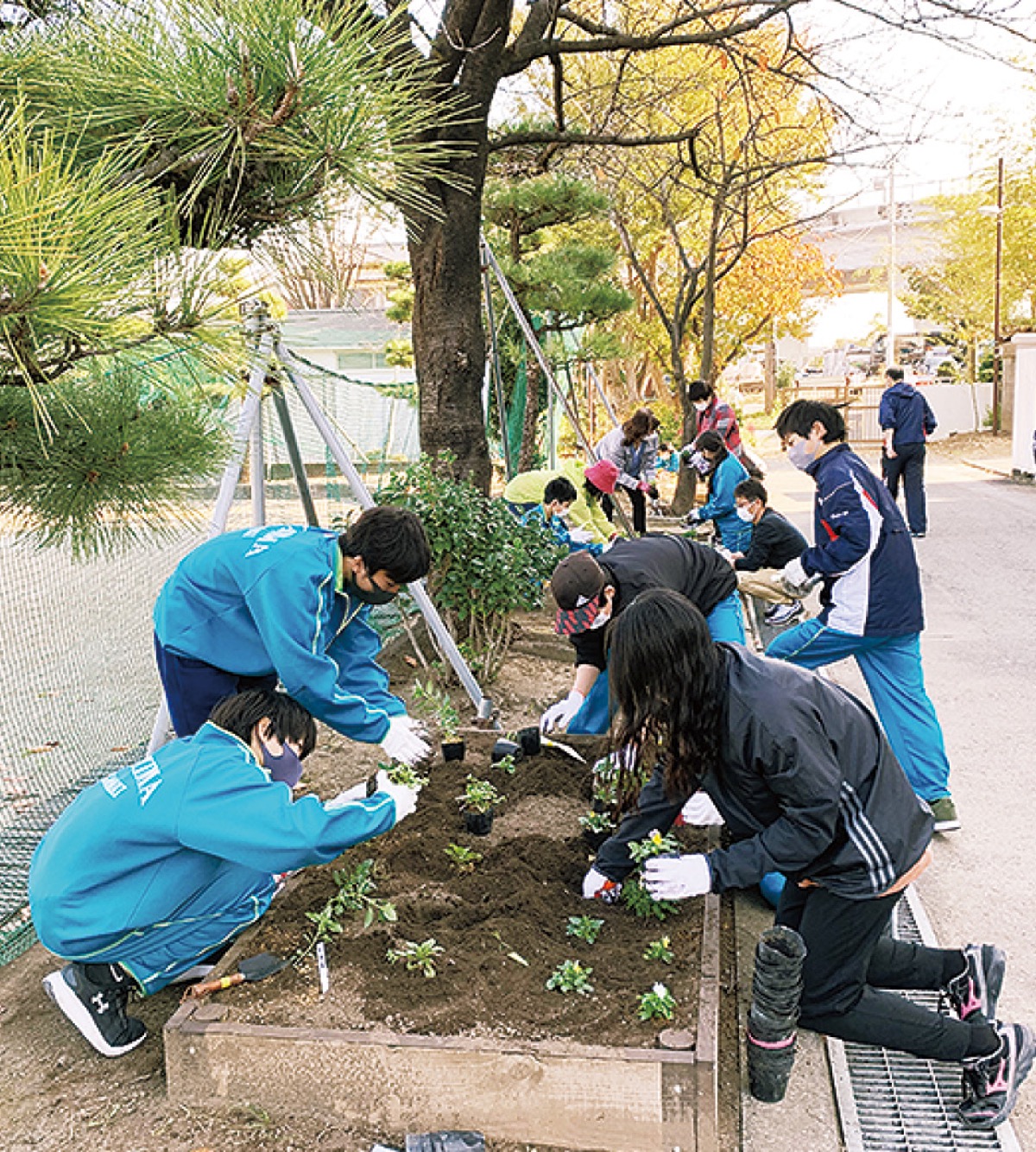 昨年創立45周年を迎えた同校は、それを記念した花壇を地域住民らと協力し、校舎や体育館前に造営していた。今回の植栽もその花壇を使用し、約250苗を一株ずつ丁寧に植えていった。