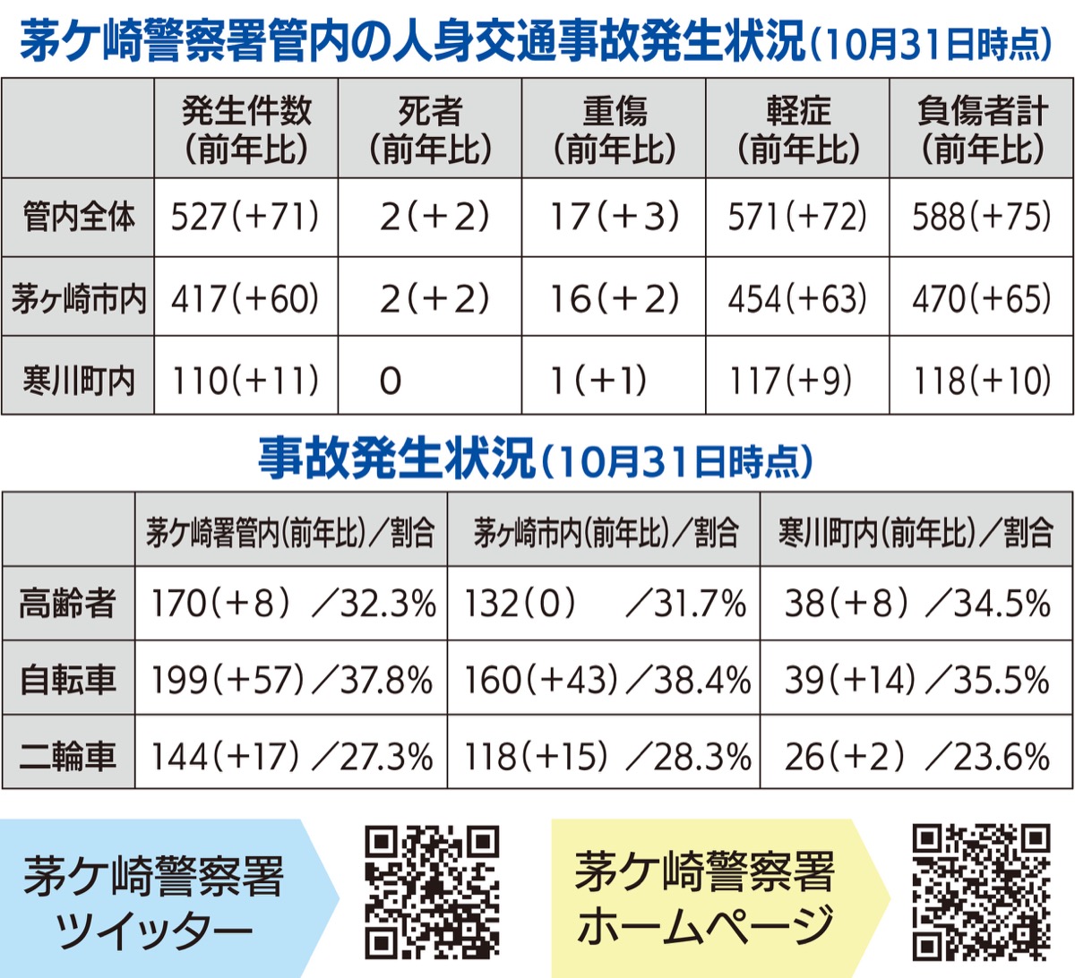 茅ケ崎警察署管内で10月末までに発生した人身交通事故は、前年比71件の増加となる527件。これは県内でワースト7位となる数字だ。