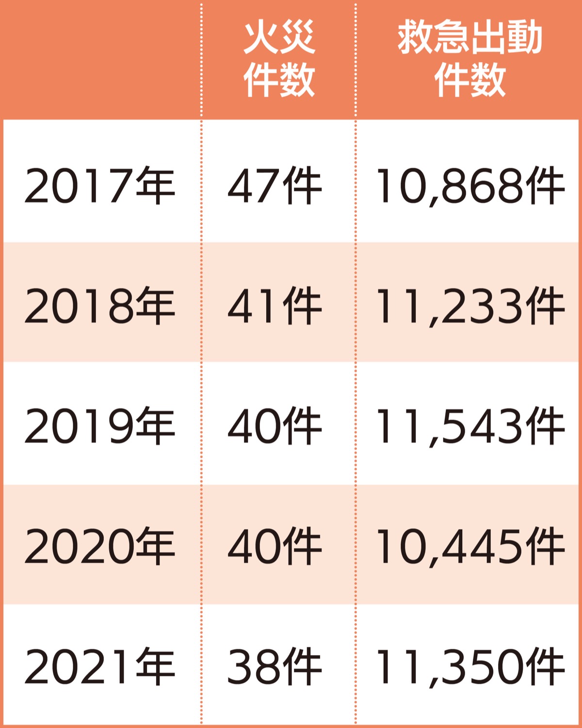 21年の火災件数は、5年ぶりに40件を下回る38件、このうち建物火災が28件、車両火災4件、枯草による延焼や農具置き場からの出火など、その他の出火は6件。