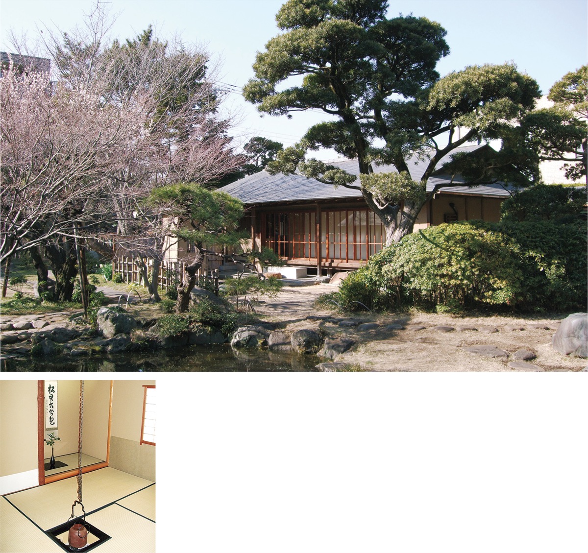建物は、茶室と書院を渡り廊下で結ぶつくりで、茶室は京都にある裏千家の代表的な茶室である「又隠」を、書院は表千家不審菴の「松風楼」を模した。