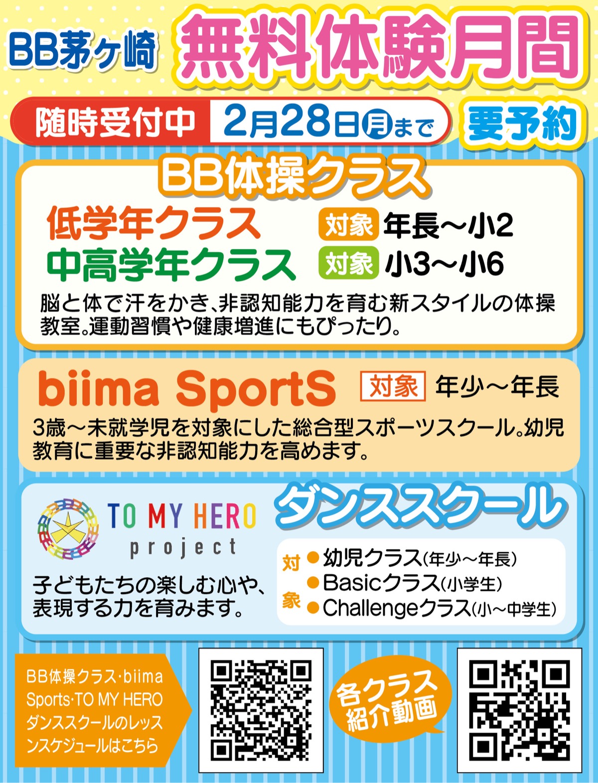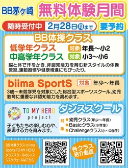 イオンスタイル湘南茅ケ崎2階のスポーツ施設「BB茅ヶ崎」が、新学年への準備に向け幼児から小学6年生を対象にした人気の「BB体操クラス」「biima Sports」「TO MY HEROダンススクール」の無料体験を実施する。