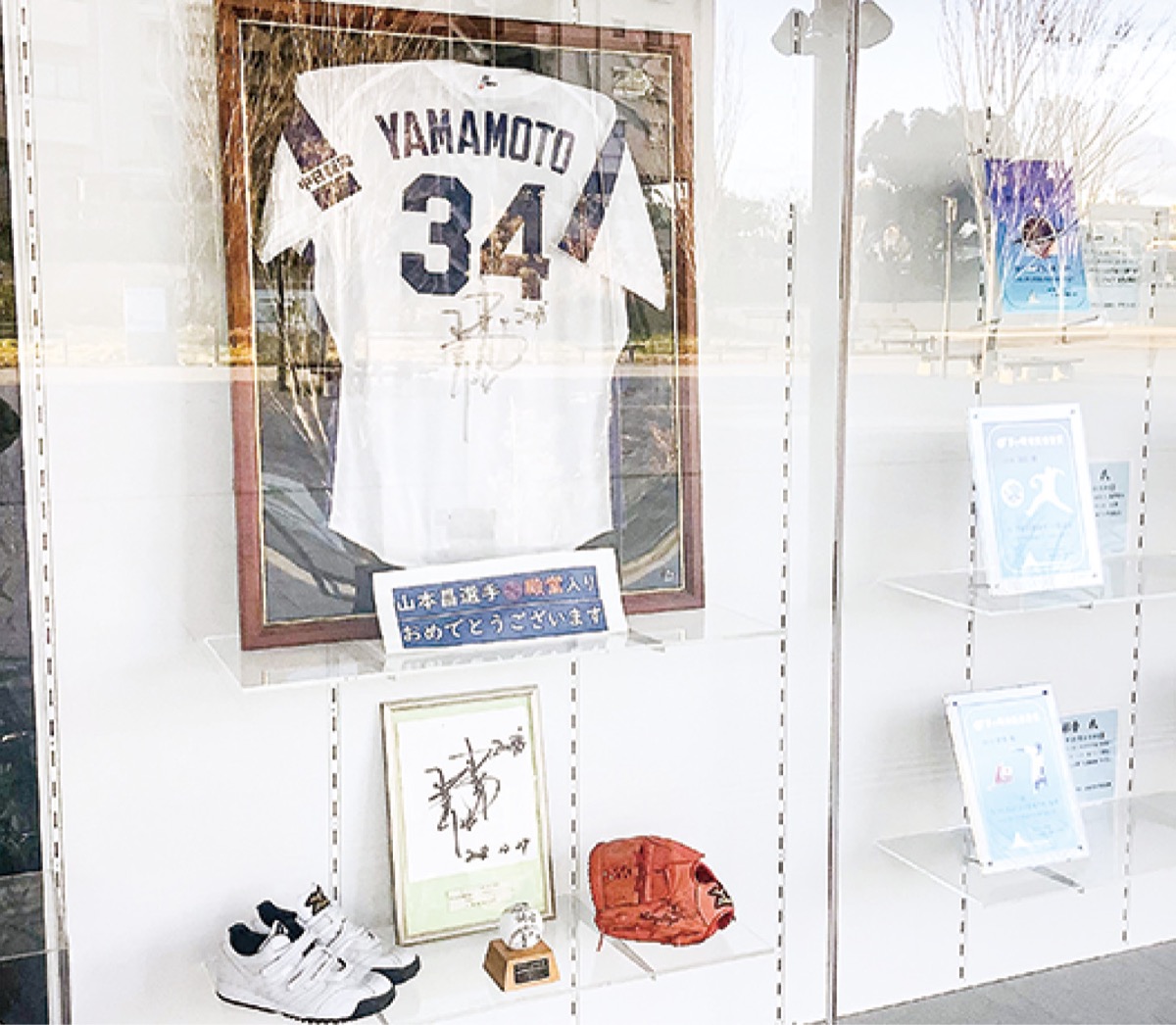 殿堂入りをたたえ、市役所東玄関前のガラスケースには、ユニフォームやグローブ、ボールなどが展示。そのほか、市役所等の電子看板では、写真とともに殿堂入りを祝福するメッセージが表示されるなど、祝賀ムードに包まれている。