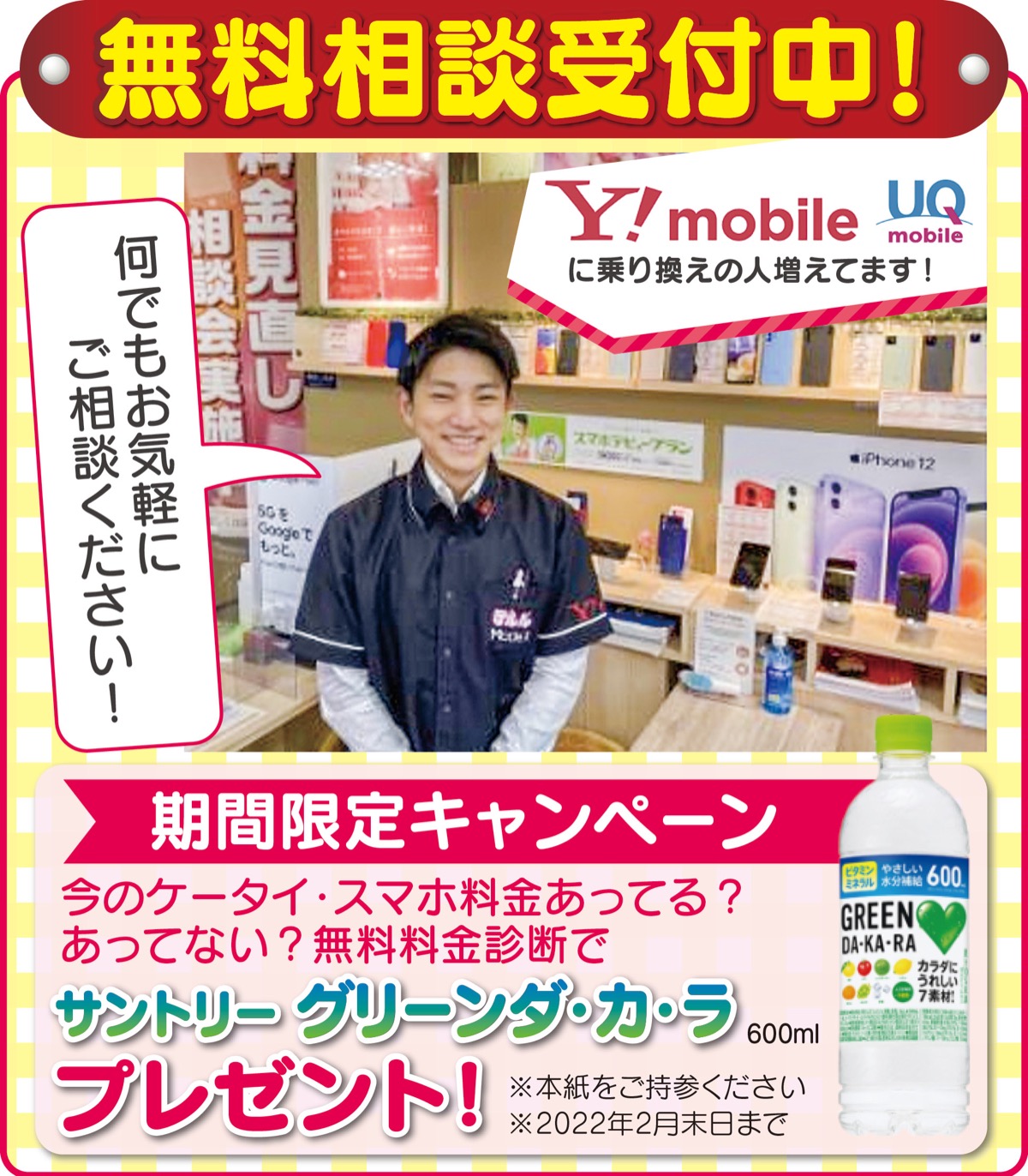 「無料の料金診断で必要のないオプション・プランを見直して、料金を安くできますよ」と同店。ガラケー同様に折りたためる「ガラホ」や話題の格安スマホも取り扱い。購入後の設定・操作アドバイスなどアフターフォローも万全なので安心。まずはお気軽にご相談を。