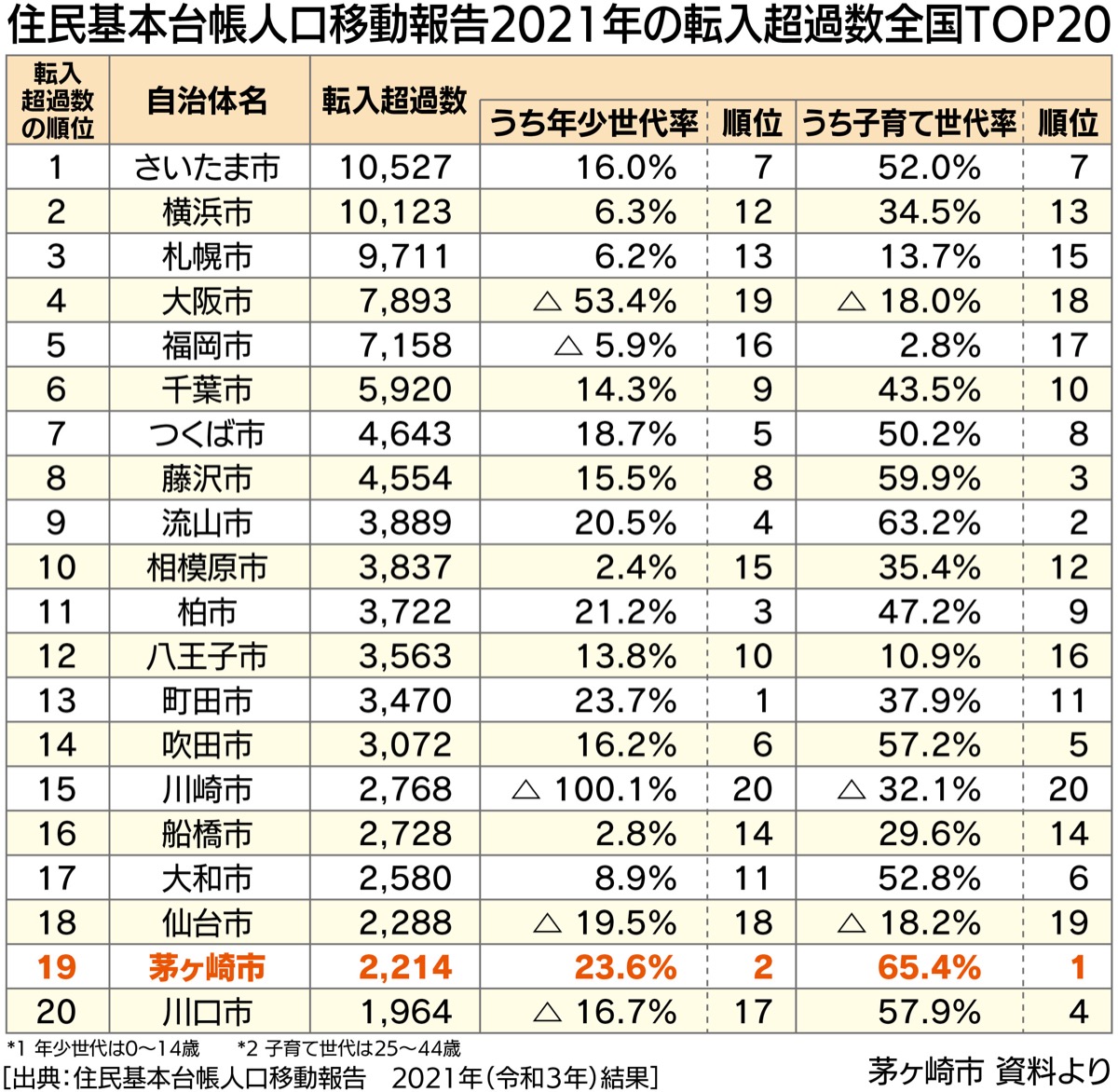 総務省が1月28日に公表した「2021年住民基本台帳人口移動報告」によると、茅ヶ崎市は転入者が転出者を上回る「転入超過数」が2214人となり、全国の市町村で19位にランクインした。年齢別では子育て世代が6割以上を占めて全国1位となったほか、東京23区から転入した人の増加率も全国1位となった。コロナ禍によるライフスタイルの変化で、新たな居住地として茅ヶ崎が選ばれている現状が、データからも明らかになった。
