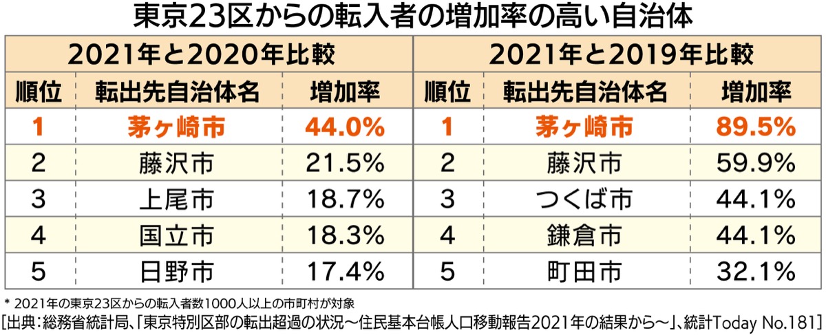 その「転出先」として茅ヶ崎市も選ばれており、21年の23区内からの転入者は20年と比べて564人増加。増加率が44・0%となり、2年連続で全国1位となった。新型コロナ流行前の19年比では、89・5%の大幅増となっている。