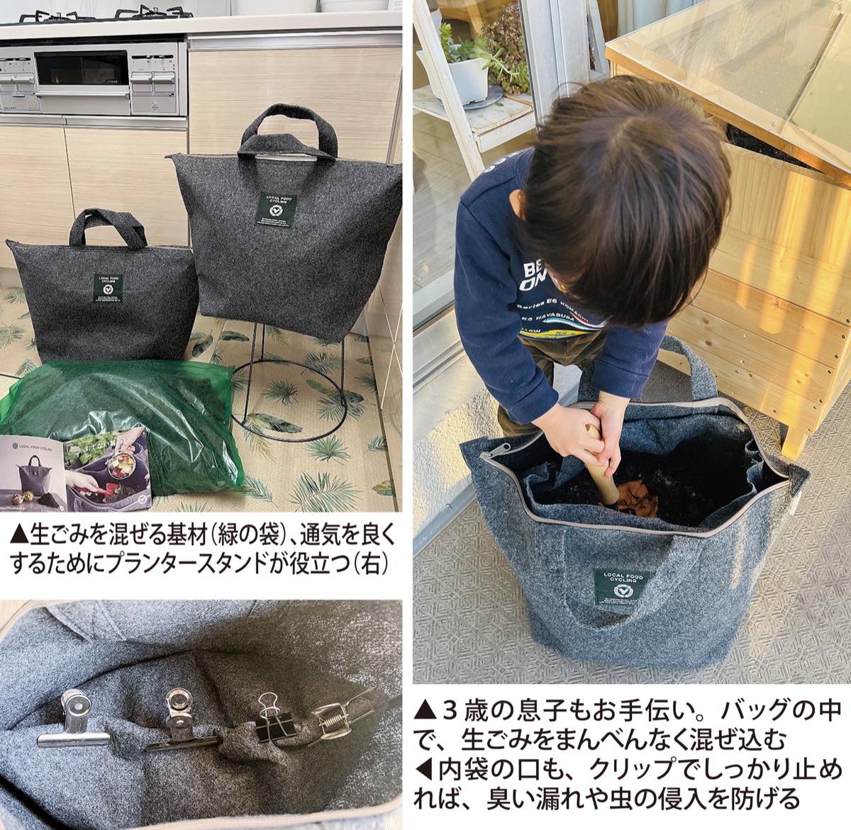 いよいよ4月から燃やせるごみの有料化がスタートする。市内で子育て中の記者Oは、昨年から2種類のコンポストを用意し、家族で生ごみ削減に取り組んでいる。【前編】で紹介した木製コンポスト「キエーロ」に続いて、【後編】では「トートバッグ型コンポスト」についてレポートする。