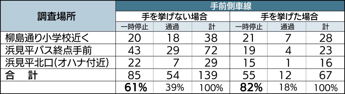 柳島や浜見平地区などをエリアとする湘南地区まちぢから協議会(後藤金蔵会長)が3月5日、地区内の信号機のない横断歩道3カ所で、歩行者が「手を挙げた場合」と「挙げない場合」の車両の一時停止について調査を行った。結果、手を挙げた場合の一時停止率は8割(挙げない場合は約6割)を超えた。
