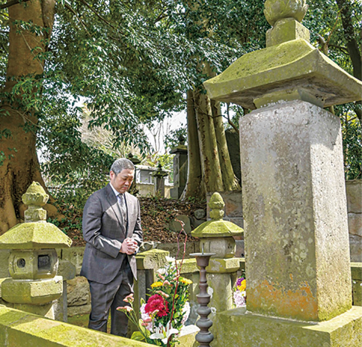歌舞伎俳優の尾上松緑さん(47)が3月17日、市内堤の浄見寺を訪れ、大岡越前守の墓参りを行った。