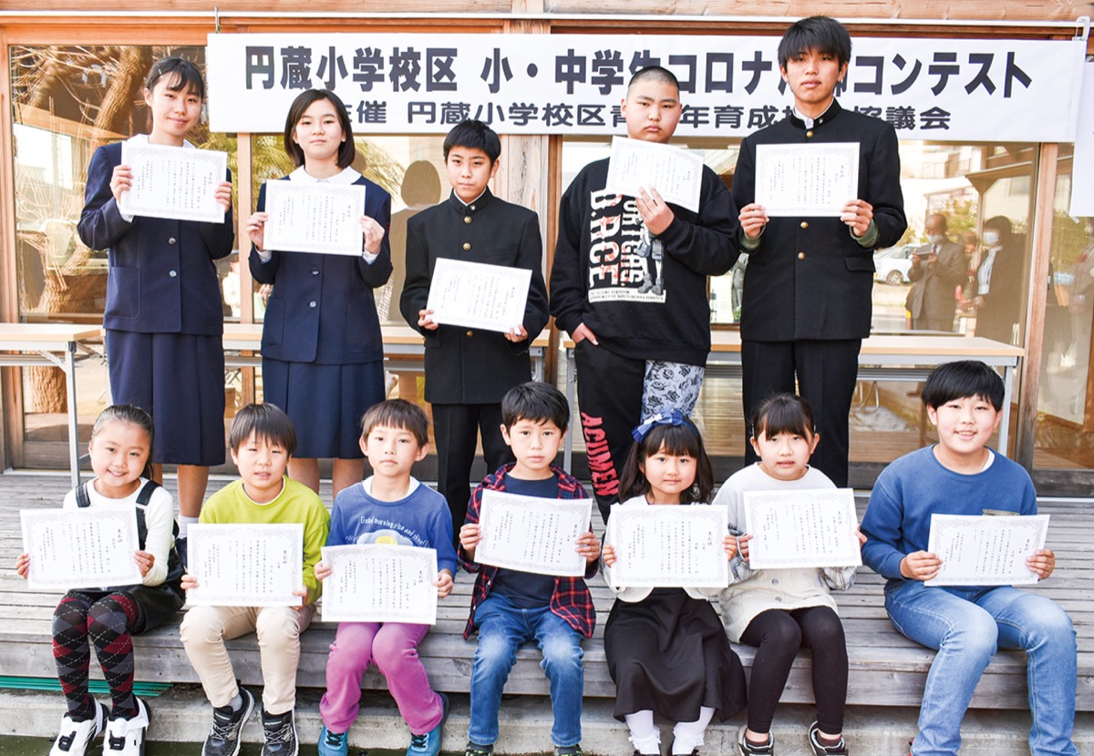 円蔵小学校区青少年育成推進協議会(吉本秀文会長)は3月24日、「円蔵小学校区小・中学生コロナ川柳コンテスト」の表彰式を円蔵のレンタルスペース・ホリデービレッジで開いた。受賞者には、吉本会長や円蔵小中学校長から表彰状や副賞が手渡された。