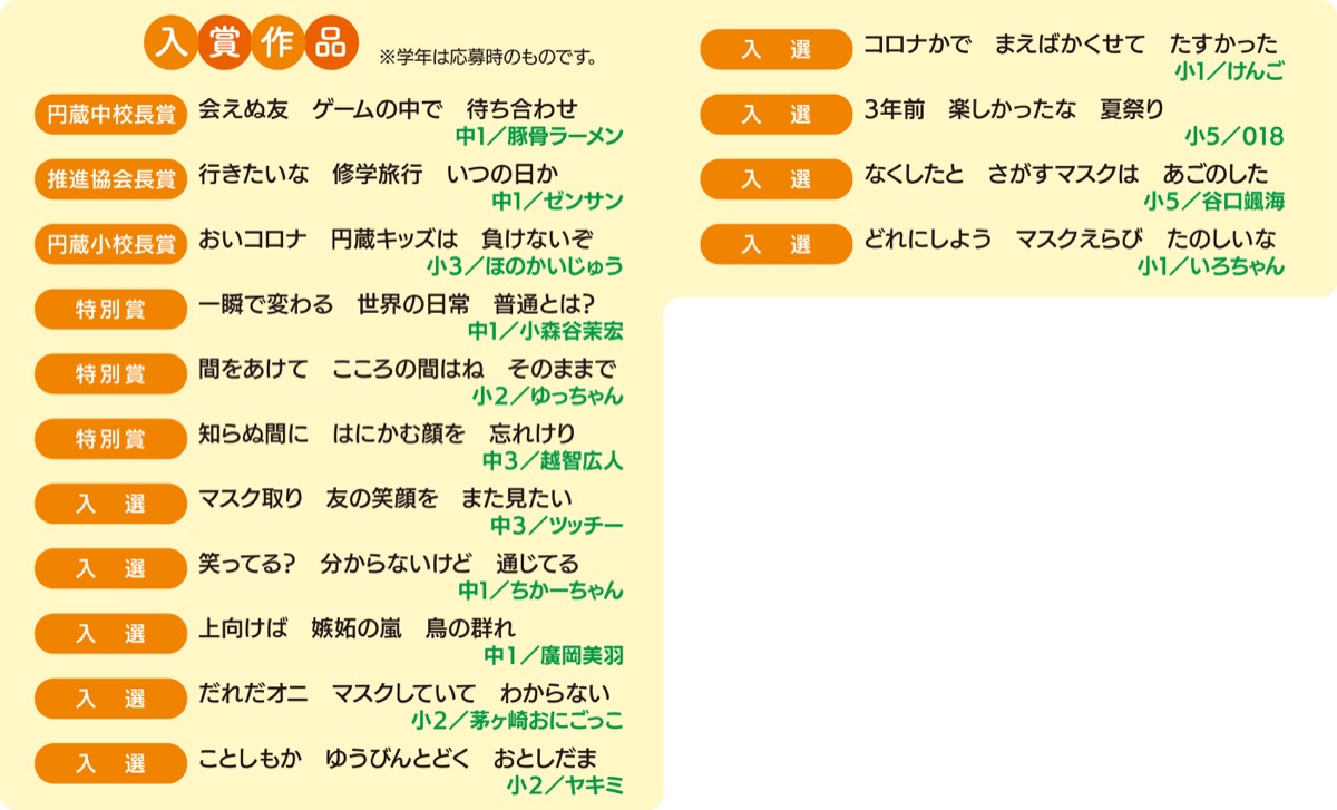 「コロナに負けない気持ち、戸惑う気持ち、こんな体験した」など新型コロナをテーマに川柳を募集したところ、およそ1カ月で円蔵小中学校138人から365句の応募が寄せられた。作品は両校の各校長と同会によって審査され、15人が入賞した。