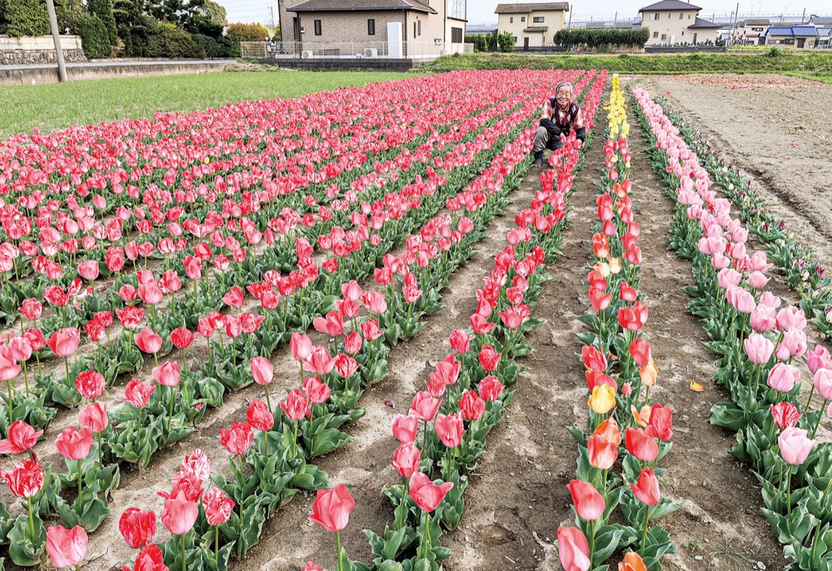 自然豊かな寒川町田端地区の一角に、突如として出現するチューリップ畑=写真・4月7日撮影。近所に住む石黒鉄男さん(79)が、「咲いてれば私が元気っていう証拠になるから」と、26年前から毎年のように育てている「元気の証」だ。