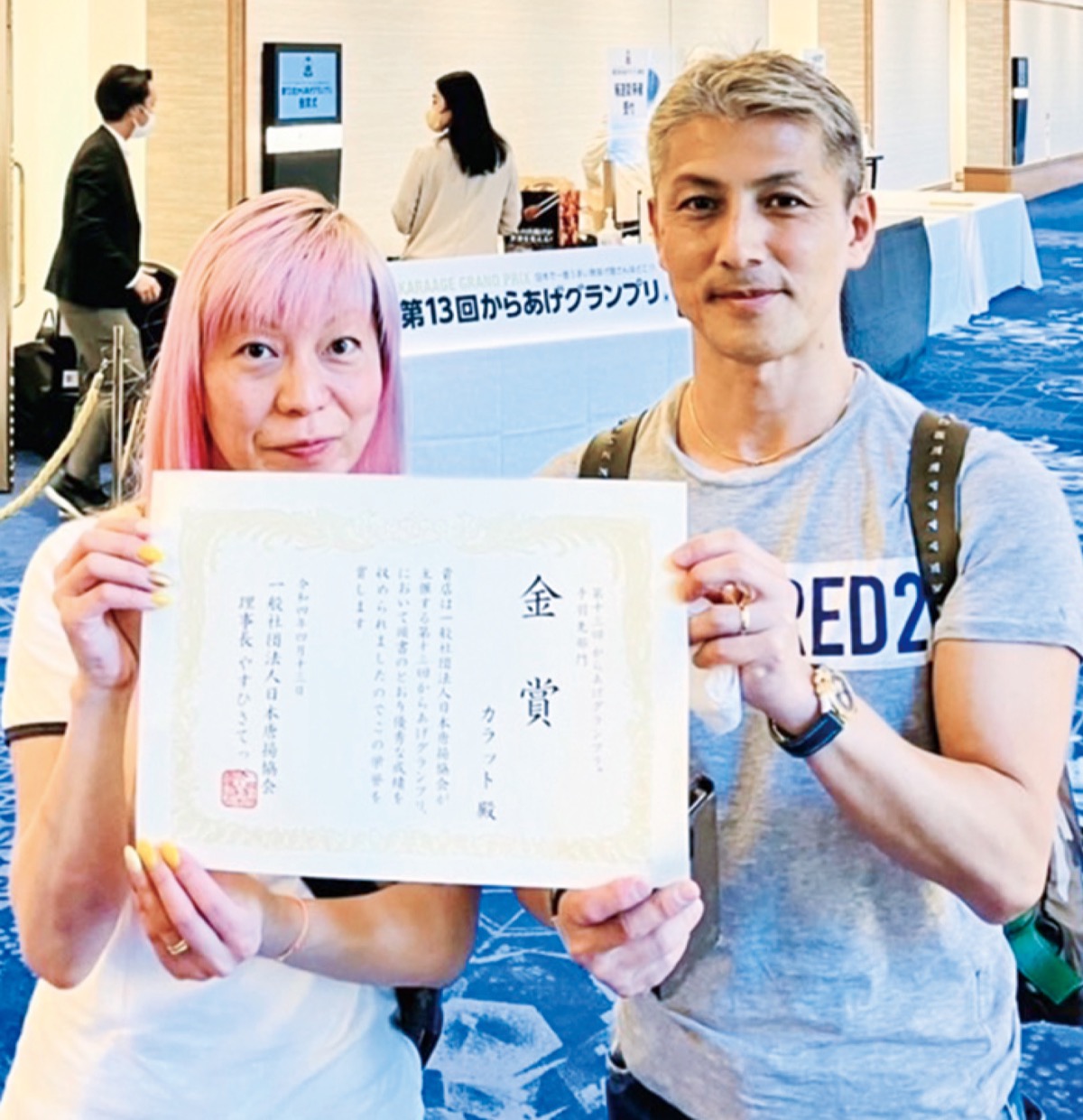 愛媛県松山市発祥の「カラット」は、茅ヶ崎店の錦谷晴美さんの弟の店を暖簾分けする形で、夫の斉さんと2018年に関東に初進出。ニンニクやショウガは使わず、高知県の天日塩を使ったシンプルなからあげは、鶏本来のうまみが凝縮。さっぱりとした味わいとカラッとした食感は、冷めても美味しいと老若男女から人気を集める。これまで同グランプリの塩ダレ部門で、5年連続金賞を受賞する自信作だ。