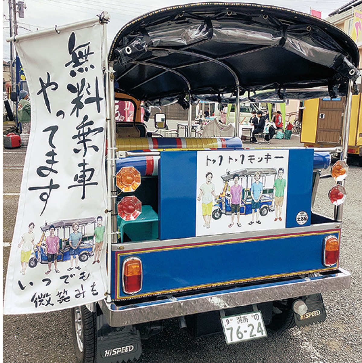 車両背面に「トゥクトゥクモンキー」という看板を掲げ、市内を走行しているのは、今宿在住の煤賀(すすが)正人さん(42)。
