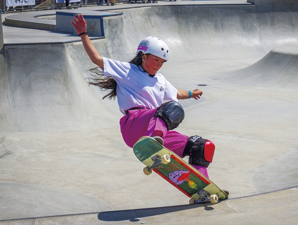 松浪在住の溝手優月さん(15)が4月9日、10日に藤沢市の鵠沼海浜公園スケートパークで行われた「第1回マイナビスケートボード日本オープン」パーク種目に出場し、4位に入った。