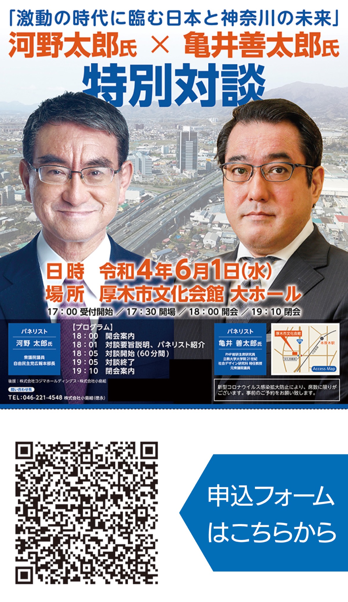 衆議院議員の河野太郎氏と、PHP総研主席研究員で元衆議院議員の亀井善太郎氏の特別対談『激動の時代に臨む日本と神奈川の未来』が6月1日(水)、厚木市文化会館大ホール(厚木市恩名1の9の20、小田急線本厚木駅から徒歩13分)で開催される。午後5時受付開始、5時30分開場、7時10分閉会予定。