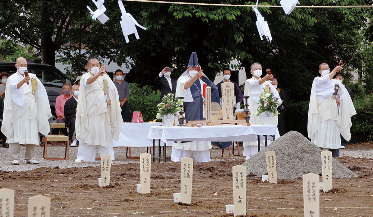 地鎮祭は、日蓮宗の大荒行堂での修行を成満した僧侶”修法師”により行われた。鈴木錬恵住職は「本堂の建て替えは100年ぶりくらいの出来事。新しい一歩が始まりました」と話した。