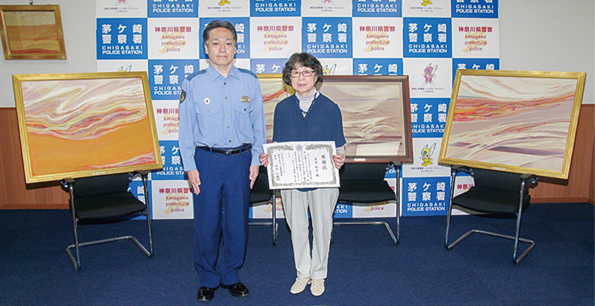 中海岸在住の油彩画家・岩本和子さん=人物風土記で紹介=が今年2月に自身の絵画4点を茅ケ崎警察署へ寄贈した。これを受け、5月26日に坂本仁義署長から感謝状が贈られた。
