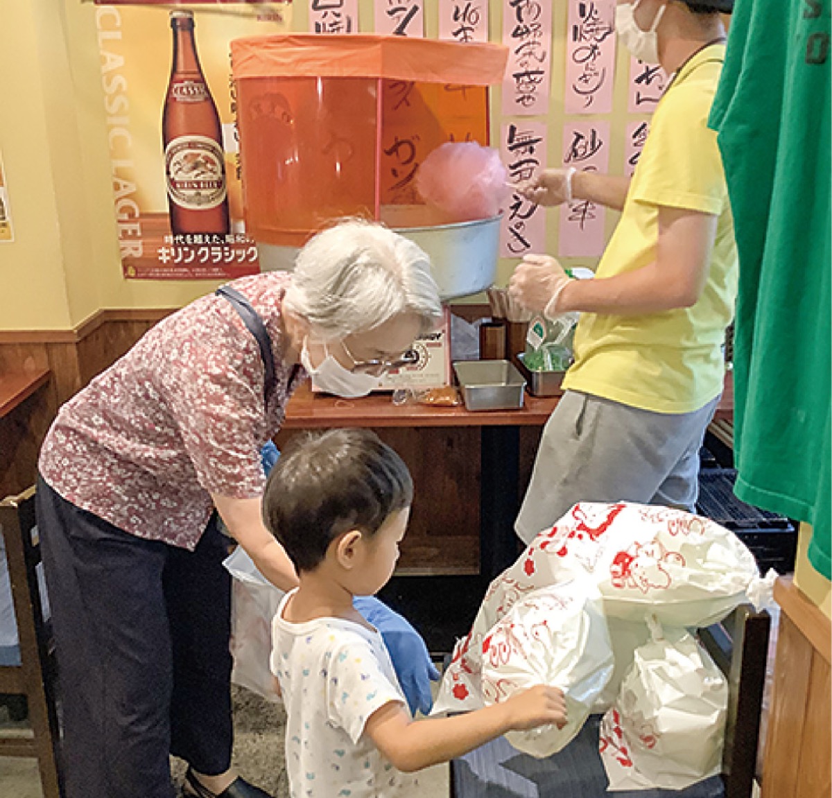 浴衣やアロハシャツ姿のスタッフは、訪れた親子連れに「炭火焼・焼き鳥丼」と味噌汁、ゼリーを振る舞ったほか、食後にはわたあめを配布。ヨーヨー釣りに夢中の子どもらの姿も見られた。