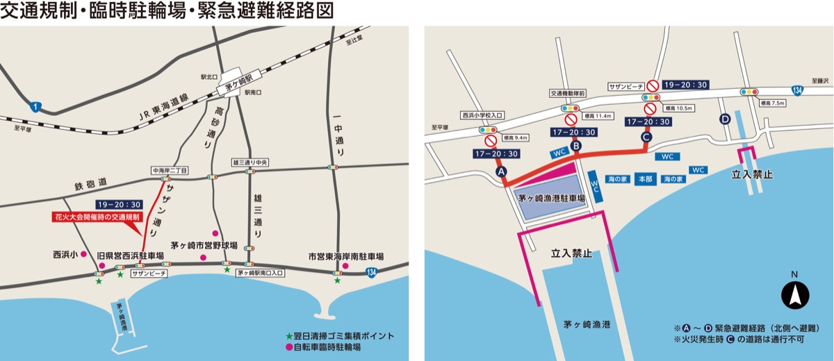 また、臨時駐輪場の場所、緊急避難路については左上のマップを事前に確認の上、来場を。問い合わせは花火大会実行委員会【電話】0467・84・0377へ。