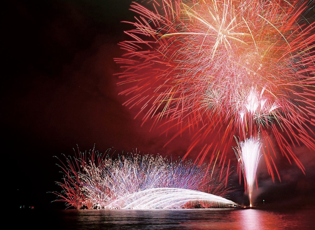 例年50分間約3000発を打ち上げてきたが、今回は約15分間に短縮。それでも、連続打ち上げ花火「スターマイン」や、孔雀が羽を広げたように海面から打ちあがる「水中孔雀」などが夜空を彩る。