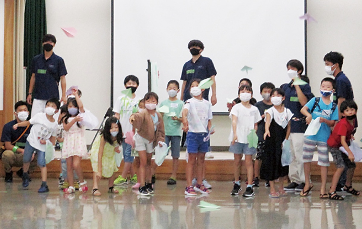 鶴嶺東コミュニティセンターで紙ひこうき作り教室が8月28日にあり、地域の小学生など子ども約20人と保護者が参加した。東海大学の人力飛行機チームTUMPA(ツンパ)の学生らが講師を務め、3種類の紙ひこうきの折り方と飛ばし方のこつを教えた。同チームの活動についても紹介した。