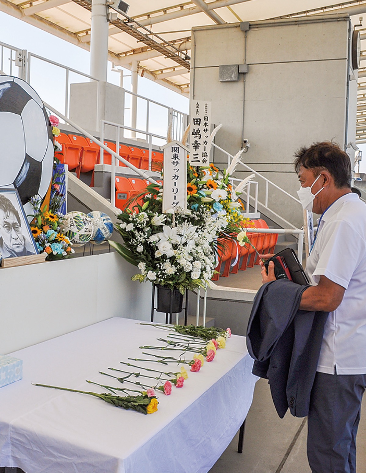 8月27日、柳島スポーツ公園で開かれた同協会主催の「偲ぶ会」には、三村さんの薫陶を受けた多くのサッカー関係者が出席。追悼のメッセージを寄せたほか、スタンドに設けられた献花台に花を供えた。