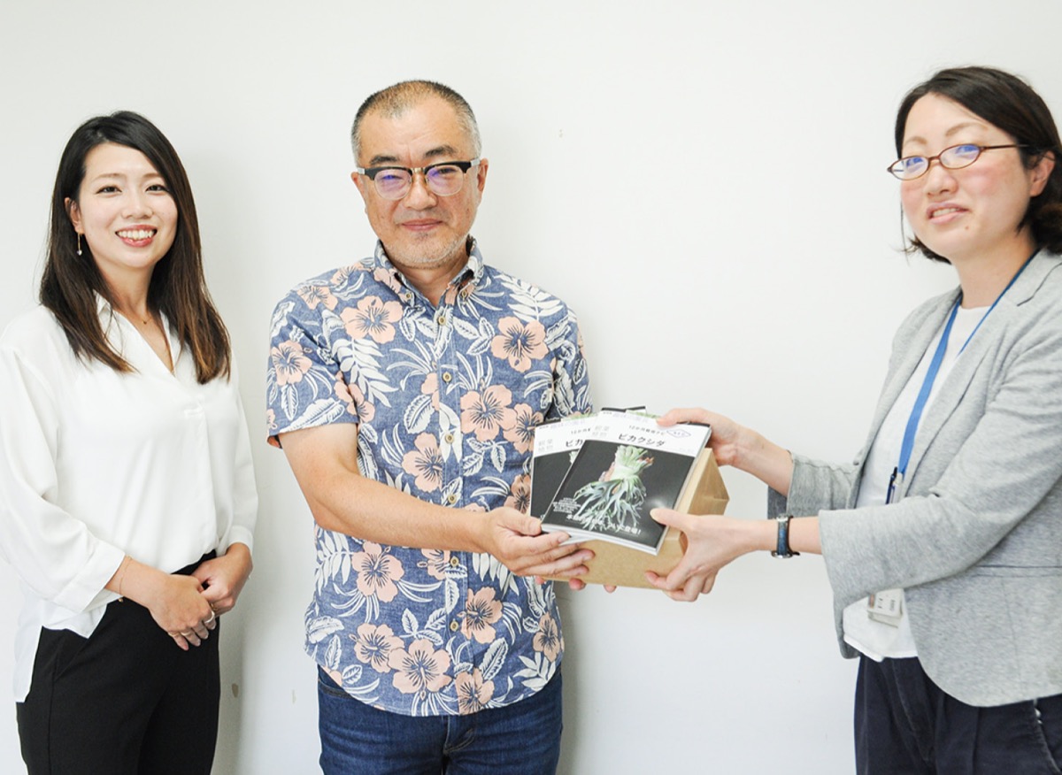 この本は熱帯植物栽培家で、同社の役員を務める杉山拓巳さんがNHK出版の「趣味の園芸」シリーズから出版したもの。ビカクシダという木や岩壁にくっついて育つ植物の栽培法について紹介している。寄贈のため市を訪れた同社の栗田雅裕社長は「この本を読んで子どもたちが園芸に少しでも興味を持ってくれたら」と期待を寄せた。