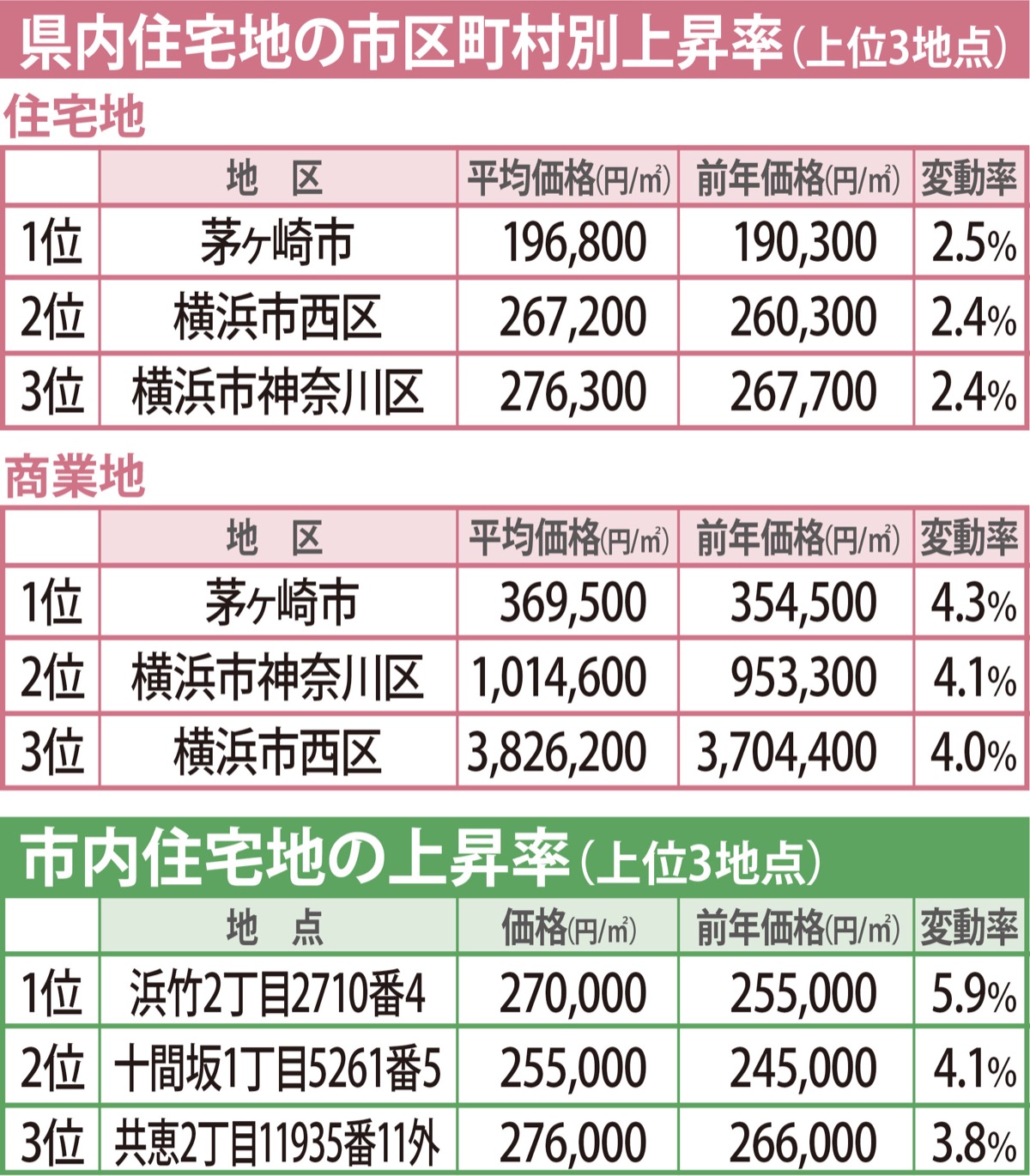 神奈川県は9月20日、7月1日時点の基準地価格を発表した。茅ヶ崎市では、住宅地が2・5%、商業地が4・3%上昇し、いずれも市町村別で県内1位の上昇率だったほか、市内浜竹2丁目の住宅地においても、最も高い上昇率を記録した。