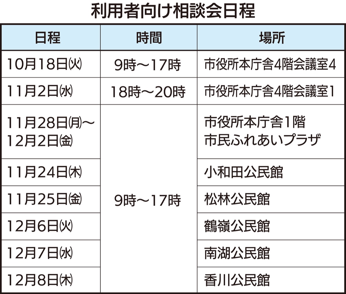 また市は10月18日(火)から、消費者向けの相談会を市役所や5カ所の公民館で開催する(上表)。アプリのダウンロード方法など、利用についてスタッフに確認することができる。