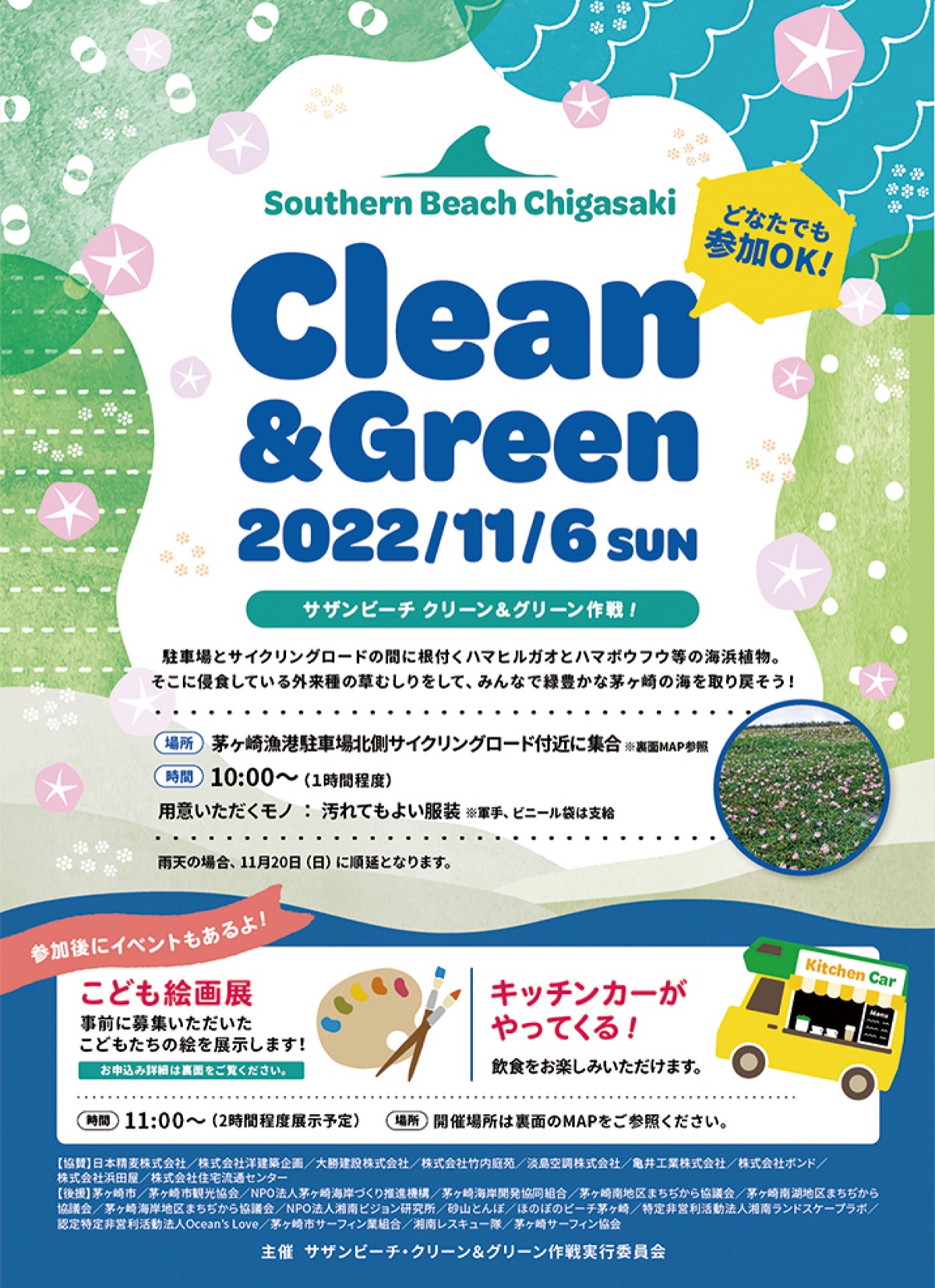 サザンビーチ付近の景観美化キャンペーン活動「サザンビーチクリーン&グリーン作戦!」が11月6日(日)に初開催される。参加希望者は汚れてもよい服装(軍手・ビニール袋は支給)で、午前10時までに茅ヶ崎漁港駐車場北側サイクリングロード付近に集合。活動は1時間程度を見込んでいる。雨天の場合は11月20日(日)に順延される。主催はサザンビーチ・クリーン&グリーン作戦実行委員会、茅ヶ崎市など後援。
