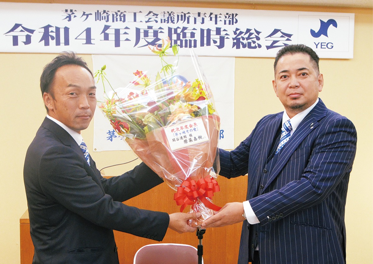 会員89人のうち、臨時総会に出席した26人と委任状29人分の55人が、満場一致で新会長選出を承認した。あいさつに立った関谷さんは、来年度のテーマを「茅ヶ崎 その愛」と発表。「青年部活動の根幹には家族への愛、仕事への愛、仲間への愛、そして地域(茅ヶ崎)への愛がある。そこで23年度は茅ヶ崎への愛をいつもより多く加えてもらい、活動を行いたい」と宣言した。