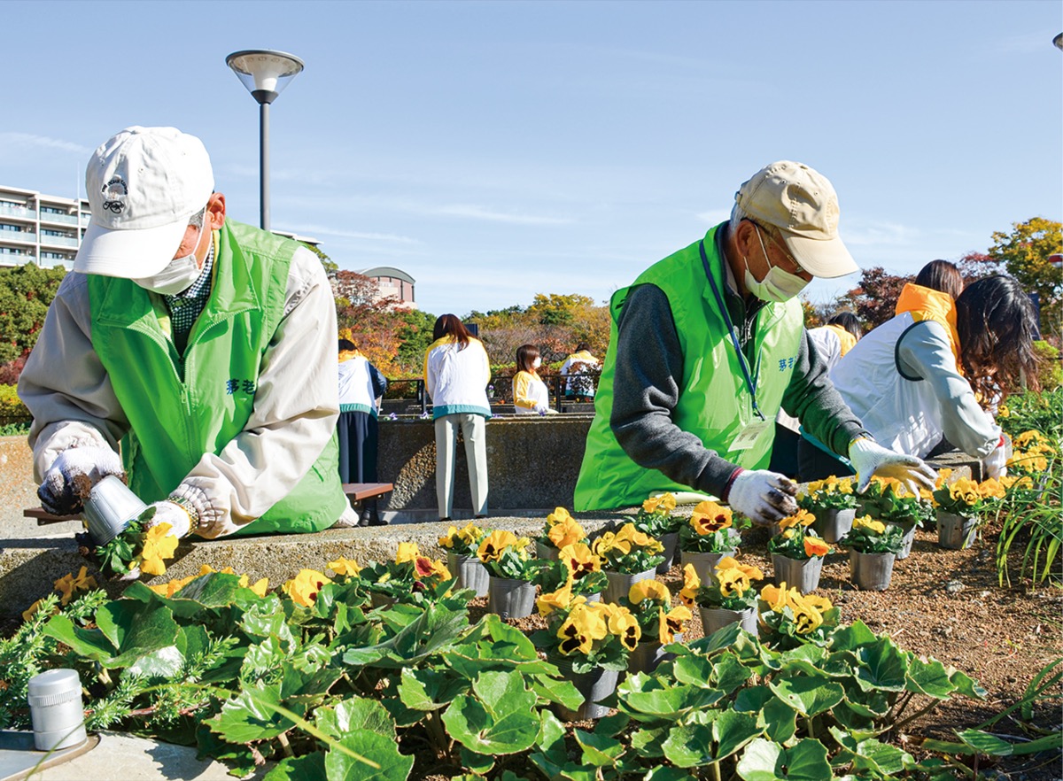 この取り組みは、中央公園など周辺と一体となった景観づくりの一環として、同館を運営する茅ヶ崎市文化・スポーツ振興財団と茅ヶ崎市老人クラブ連合会(鶴田國夫会長)が協働で行っているもの。「地元の元気プロジェクト」と題して地域貢献活動を行っている明治安田生命茅ヶ崎営業部の社員も参加、苗の費用も3者で分担した。