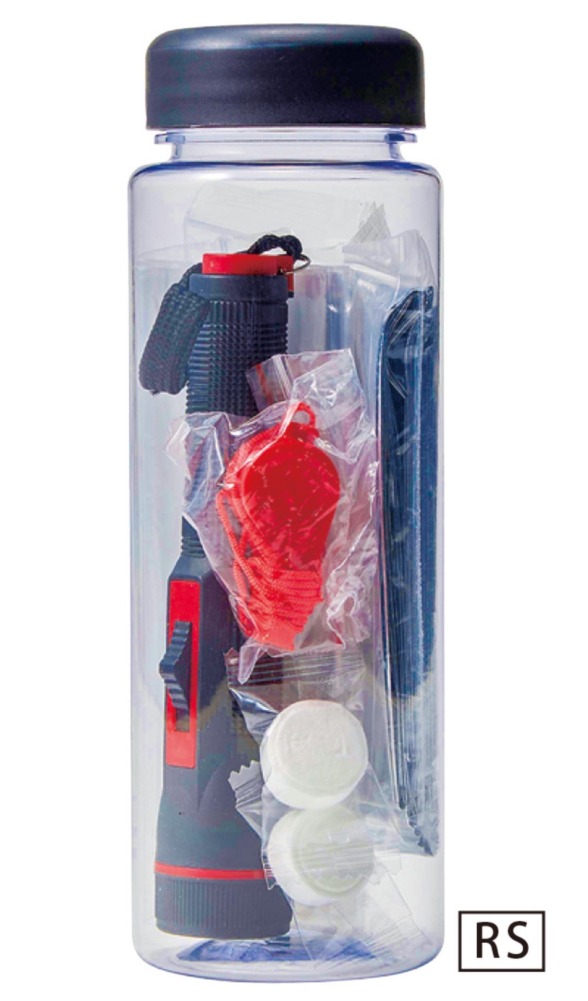 タウンニュース社では、発災時にすぐ役立つ防災ボトル=写真=の注文を受け付け中。団体名やロゴなどを印刷したオリジナル品の制作にも対応する。【1】500ミリリットルの飲料水を入れられるスリムボトル【2】ホイッスル【3】LEDライト【4】圧縮タオル【5】大判アルミシート【6】水害の際に携帯電話の保護や仕分けに使えるジッパー袋の6点セット。