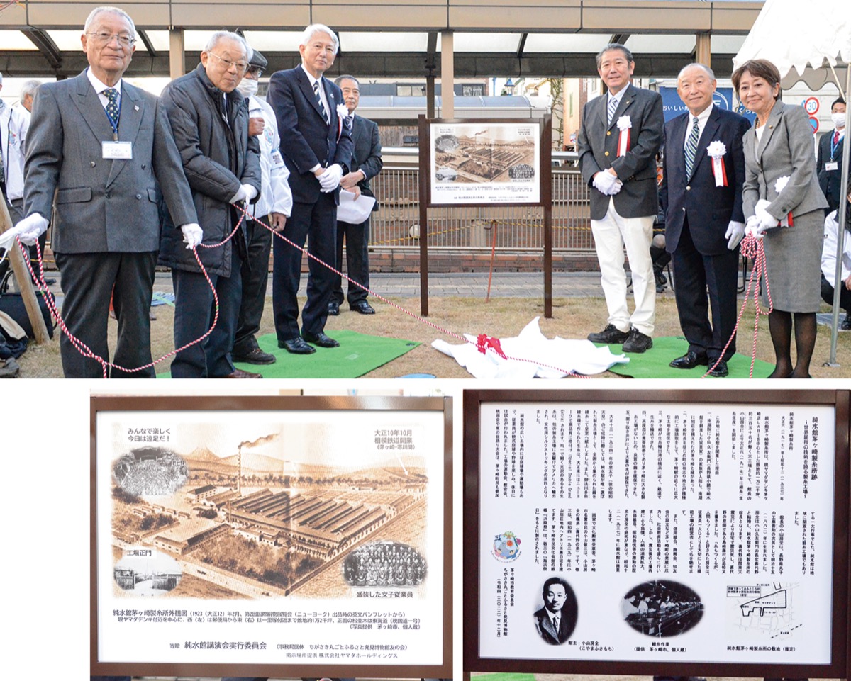 記念碑が設置されたのは、茅ケ崎駅北口にあるヤマダデンキ北側の公園。除幕式には佐藤光市長、桑野光正ヤマダデンキ前社長、製糸場の創始者・小山房全(ふさもち)の孫の掛川國雄さんらが祝福に駆けつけた。