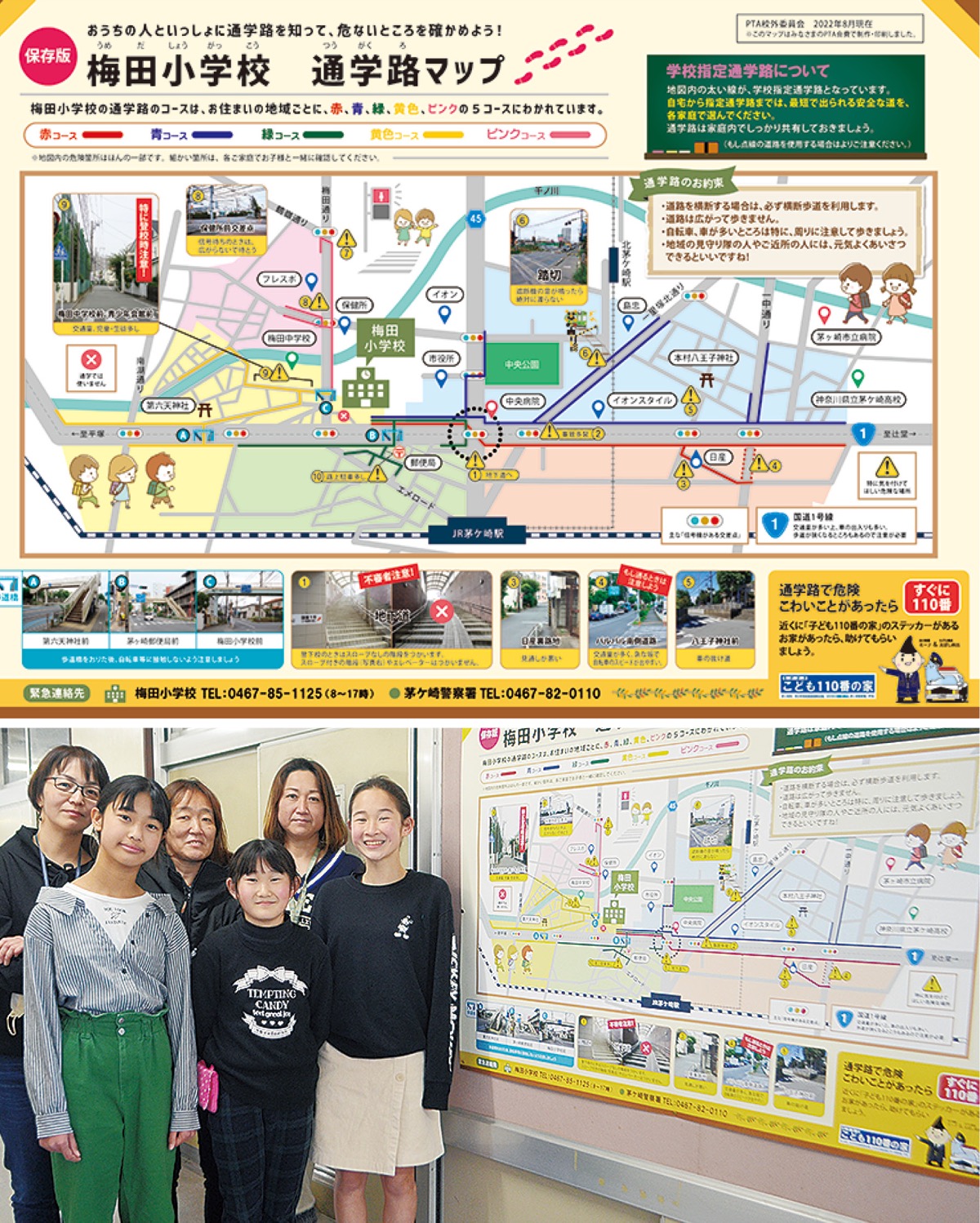 こうした状況を受けて同委員会は、指定通学路を整理するため、学校側と協議。了承を得た上で昨年12月にマップを完成させた。今後は、入学式までに梅田学区青少年育成推進協議会や茅ヶ崎地区まちぢから協議会などの協力を得て、自治会掲示板などでも周知に努めていく方針。