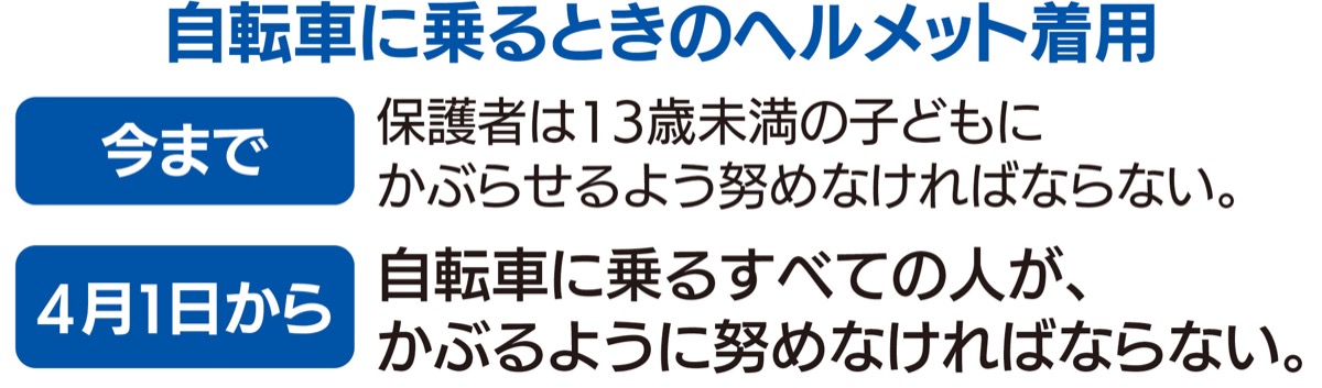 市内の自転車ショップでは3月に入ってから、ヘルメットを求める来店者が増えている。「お子さんや、スポーツタイプの自転車に乗っている人は自転車の購入時にすでにヘルメットを揃えていることが多く大人や年配の方が来られる」と話す。着用の努力義務化を前にした需要増でメーカーでも在庫が少なくなっているという。