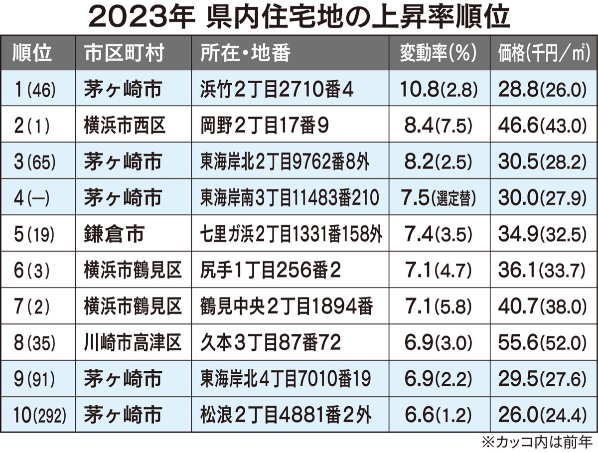 県は、国土交通省の資料をもとに2023年の公示地価を3月に公表した。茅ヶ崎市は住宅地が前年比4・1%、商業地が6・1%上昇し、いずれも伸び率が市区町村で最も高かった。また、浜竹の住宅地が上昇率で県内首位となり、10位内を市内5地点が占めた。