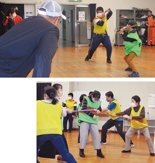 3月29日のチャンバラの稽古では熱気に包まれる中、殺陣指導の柴崎さんから「今のいいね、うまいね」と声が飛び、出演者の活気あふれる姿が見られた。