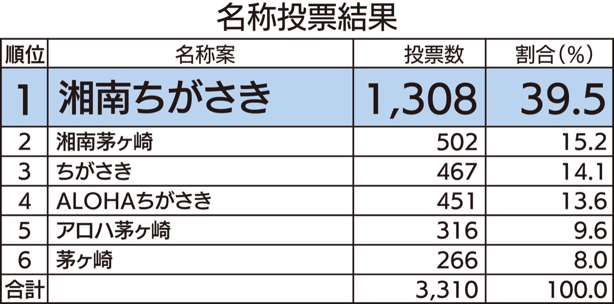 その結果、有効投票3310票のうち、39・5%に当たる1308票を集めた「湘南ちがさき」に決定した。
