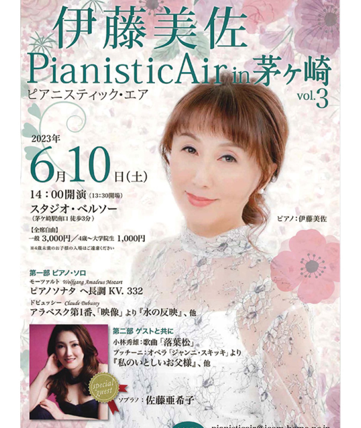 茅ヶ崎在住のピアニスト・伊藤美佐さんのコンサート「PianisticAir in茅ヶ崎Vol.3」が6月10日(土)、茅ケ崎駅南口のスタジオ・ベルソー(共恵1の8の20の5階)で開催される。洗足学園音楽大学が後援。午後2時開演(1時30分開場)。全席自由で一般3000円、4歳から大学院生は1000円(4歳未満の子どもの入場不可)。